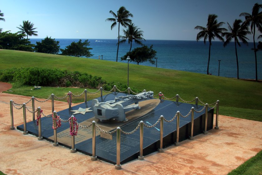 On February 9, 2001, The Ehime Maru, a Japanese high school fishery training boat, sank 9 miles off Diamond Head after the submarine USS Greeneville surfaced beneath it. Nine people on The Ehime Maru perished. In January 2002,  a memorial was built at Kaka’ako Waterfront Park in Honolulu and was unveiled in February 2002.  The memorial stands on a hill overlooking the ocean. It is made of nine granite blocks. Engravings include an outline of ship and a map of the accident site. One of the ship’s two anchors lay next to nine links from the anchor chain to signify the nine lost lives. The names of those who perished are engraved on the stone. The Japan-America Society of Hawai’i maintain the memorial with the help of volunteers from the community. This photo was taken in 2015.   Construction of Ehime Memorial Underway January 20. 2002 Memorial to Ehime Maru Nine Unveiled Japan Times Feb. 11, 2002 Ehime Maru Memorial Draws Japan Tourists June 27, 2002
